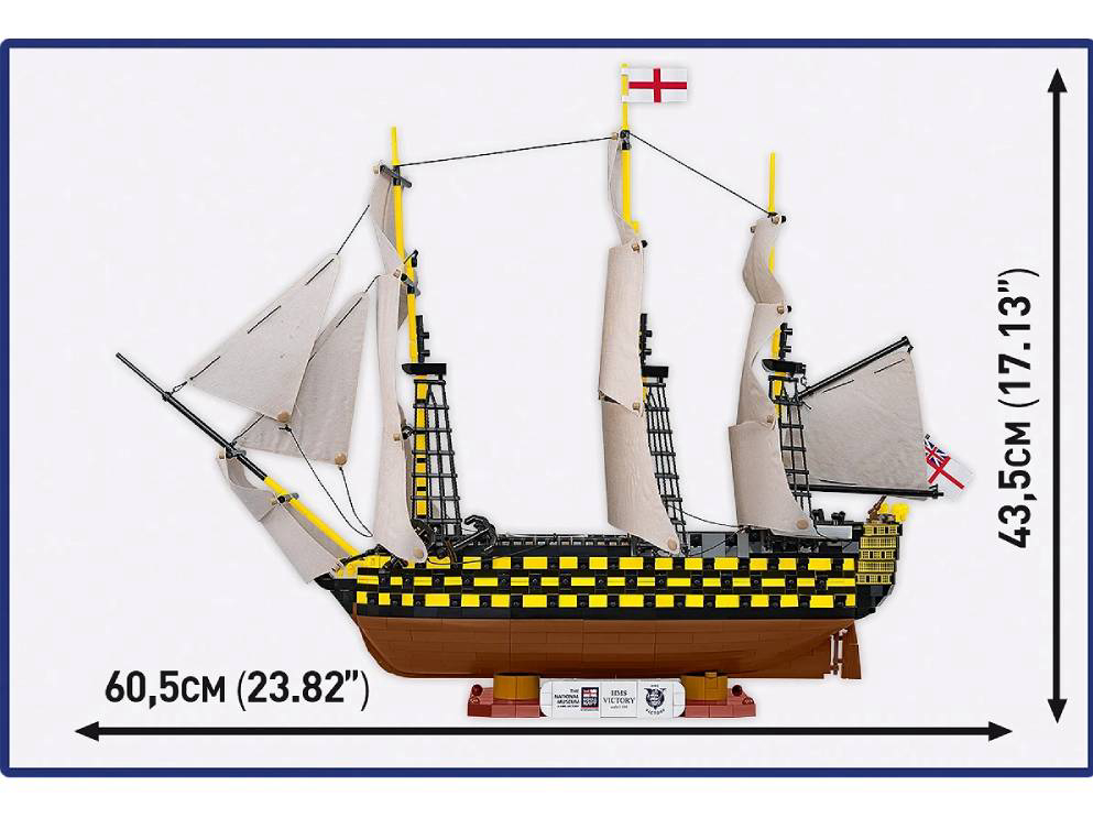 Ovaj jedinstveni set, koji se sastoji od čak 2517 dijelova, omogućuje vam izgradnju legendarnog HMS Victory u mjerilu 1:144! HMS Victory ne samo da je odigrao ključnu ulogu u bitci kod Trafalgara, već i danas opstaje kao simbol britanske pomorske moći. Izgradite model ovog legendarnog broda, doživite duh jedne od najvažnijih pomorskih bitaka Napoleonskog doba i ponosno ga izložite u svojoj kolekciji. Set se preporučuje osobama starijim od 11 godina. Dimenzije: 60.5 cm x 19.5 cm x 43.5 cm. COBI kocke kompatibilne s LEGO kockama.