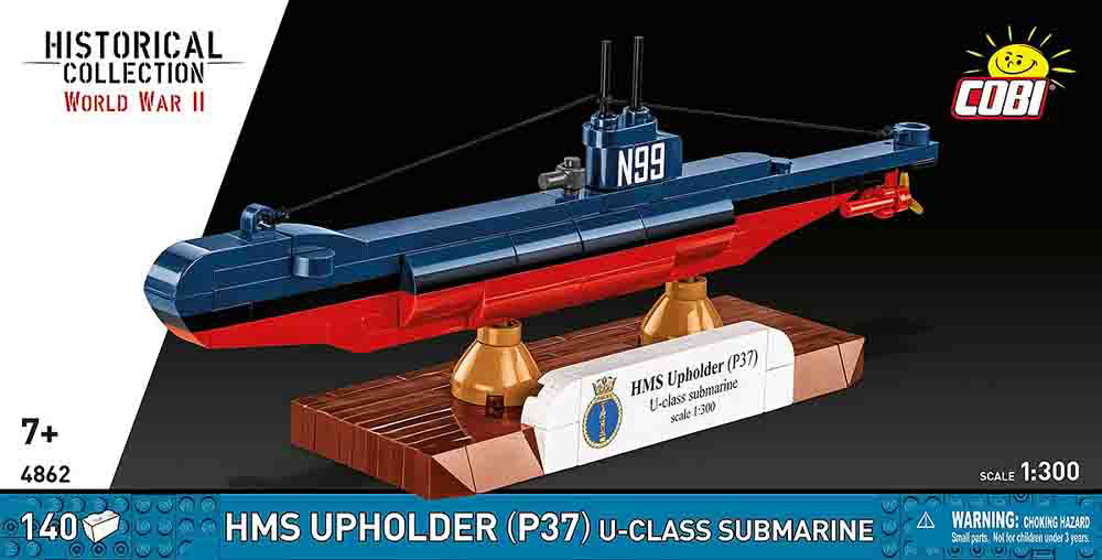HMS Upholder (P37) bila je jedna od najpoznatijih podmornica Drugog svjetskog rata. Bila je podmornica klase U koju je izgradila tvrtka Vickers-Armstrong u Barrow-in-Furnessu. U službu je ušla 31. listopada 1940. Tijekom svoje službe brodom je zapovijedao poručnik Malcolm David Wanklyn, jedan od najuglednijih zapovjednika podmornica Kraljevske mornarice. Tijekom 24 borbene patrole brod je potopio preko 93 000 tona neprijateljskog brodovlja, uključujući ratne brodove, brodove za prijevoz trupa i trgovačke brodove. Njegovi najznačajniji uspjesi uključuju potapanje Conte Rossa, Neptunije i Oceanije te oštećenje brojnih ključnih brodova Osovine. Za svoja izvanredna postignuća, Wanklyn je odlikovan Viktorijinim križem. Model se može izložiti na postolju s pločicom na kojoj je napisano ime i mjerilo broda. Sastoji se od 140 dijelova. Ovaj set namijenjen je osobama starijim od 7 godina. Dimenzije: 19.5 cm x 6.5 cm x 4 cm. COBI kocke kompatibilne s LEGO kockama.