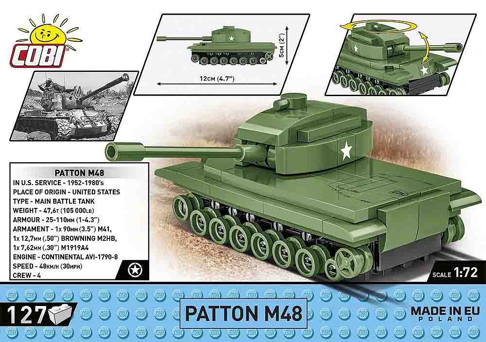 M48 Patton je tenk koji je postao ikona američkog oklopnog sustava tijekom Hladnog rata. Nazvan po generalu Georgeu Pattonu, ovaj se tenk proizvodio od 1952. do 1961. te je služio u mnogim vojskama diljem svijeta. M48 Patton korišten je u Korejskom i Vijetnamskom ratu. U nekim vojskama i danas je u upotrebi, iako su ga zamijenili moderniji tenkovi. Sastoji se od 127 dijelova. Ovaj set namijenjen je osobama starijim od 6 godina. Dimenzije: 12 cm x 4.5 cm x 5 cm. COBI kocke kompatibilne s LEGO kockama.