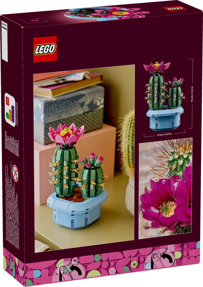 11509 LEGO Botanicals Kaktus u cvatu. Obradujte male zaljubljenike u biljke kompletom za slaganje LEGO Botanicals Kaktus u cvatu (11509) za djecu od 9 godina i stariju. Djevojčice i dječaci zabavit će se slaganjem odličnog detaljnog kaktusa. Djeca će osjetiti kako njihova kreativnost buja dok slažu 2 modela kaktusa. Veći LEGO kaktus u punom je cvatu i ima ružičasti cvijet sa žutim tučkom, a manji LEGO kaktus ima ružičaste pupoljke u različitim fazama rasta. Kaktusi su autentične nijanse zelene i oba su „posađena” u pastelnoplavu posudu za biljke, pa ih djeca mogu jednostavno izložiti u sobi ili bilo gdje u domu. Komplet za slaganje LEGO Botanicals sjajan je poklon za djevojčice, dječake i ljubitelje prirode svih dobi za rođendan i druge posebne prigode, a dostupan je i u aplikaciji LEGO Builder u kojoj djeca mogu približavati i okretati modele te pratiti napredak. Komplet ima 482 dijela. Preporučena dob: 9 ili više godina. LEGO dijelova: 482