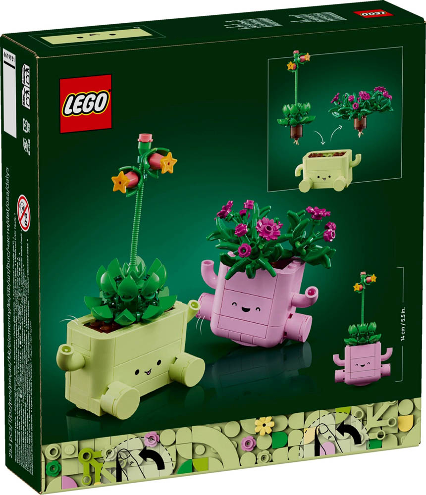 11506 LEGO Botanicals Ljuljačke biljke. Složite i izložite zabavan biljni ukras u kompletu LEGO Botanicals Biljke za ljuljanje (11506) za djevojčice, dječake i ljubitelje prirode od 9 godina i starije. Širite radost uz dva LEGO modela biljaka u posudama pastelnih boja, delospermu (pustinjsku ružu) Lumi s ljubičastim pupovima i eševeriju Ellie s dugom stabljikom i koraljnim pupovima. Posude imaju slatka nasmiješena lica i zaobljena dna, pa se ljuljaju kada ih gurnete. Svijetlozelena posuda ljulja se naprijed-natrag, a svijetloružičasta lijevo-desno. Ako želite još više zabave, obje LEGO biljke kompatibilne su s objema posudama, a možete im zamijeniti mjesta i s posudama iz kompleta Vesele biljke (10349), koji se prodaje zasebno. Tako će djeca još lakše pokazati kreativnost i sastaviti ukras za sobu po svom ukusu. Komplet za slaganje cvijeća odličan je rođendanski ili blagdanski poklon za ljubitelje biljaka, pa možete obradovati slavljenike ili ih zadržati za sebe. Komplet ima 253 dijela. Preporučena dob: 9 ili više godina. LEGO dijelova: 253