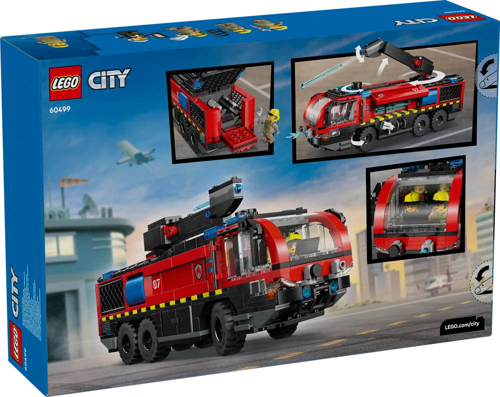 60499 LEGO City Vatrogasni kamion zračne luke. Pozovite vatrogasce i LEGO City Vatrogasni kamion zračne luke (60499) za djecu od 7 godina i stariju. Realistični model vozila hitne službe ima aparat na krovu koji može napraviti puni krug, bočna skladišta opreme koja se otvaraju i pretince za pohranu alata. Djeca mogu upravljati kamionom okretanjem zupčanika, ispaljivati vodene elemente iz aparata i izvaditi dijelove motora da ih poprave. Model kamiona ima 6 velikih gumenih kotača i detaljnu kabinu s prostorom za 4 figurice vatrogasaca. Potrebna je samo iskra mašte da u djeci počnu tinjati junačke vatrogasne pustolovine. Komplet za slaganje kamiona odličan je poklon za rođendan ili bilo koji dan za djecu koja vole aktivnu igru. Kombinirajte ga s drugim kompletima LEGO City (prodaju se zasebno) za još veće pustolovine. Djeca mogu samouvjereno slagati uz aplikaciju LEGO Builder s alatima za približavanje, okretanje 3D modela i praćenje napretka uz jednostavne digitalne upute. Komplet ima 691 dio. Preporučena dob: 7 ili više godina. LEGO dijelova: 691