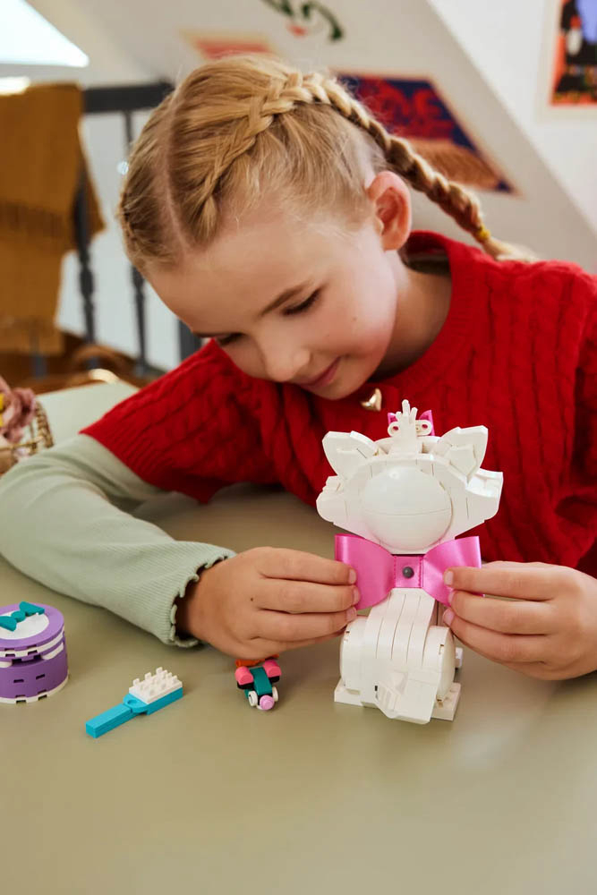 43286 LEGO Disney The Aristocats Predivna Marie. Iznenadite obožavatelje Disneyjevih filmova, djecu i ljubitelje životinja slatkim kompletom igračaka za slaganje LEGO | Disney The Aristocats Predivna Marie (43286). U kompletu je mačka od kocaka koju možete namještati, a namijenjena je djevojčicama i dječacima od 7 godina i starijima za kreativnu igru i ukras u sobi. Osim toga, u kompletu dobivate i kutiju s poklonom od kocaka, malog miša, četku, ribu i ružičastu tekstilnu mašnu koje služe kao nadahnuće za beskrajne priče. Složivi komplet za ljubitelje životinja odličan je za igru pretvaranja i poklon za rođendane ili blagdane. Komplet za slaganje mačke uključuje elemente i dodatke koje će obožavatelji prepoznati iz Disneyjeva filma The Aristocats i rado uključiti u nove priče dok im rastu samopouzdanje i druge životne vještine. Također mogu uživati u naprednim tehnikama slaganja uz aplikaciju LEGO Builder s alatima za približavanje i okretanje uz 3D upute u kojoj mogu i spremati komplete i pratiti napredak. Ima 369 dijelova. Preporučena dob: 7 ili više godina. LEGO dijelova: 369