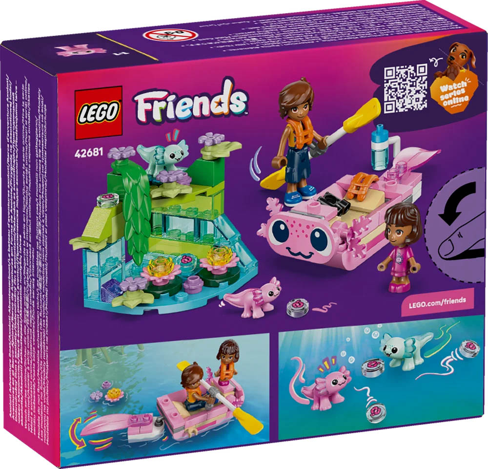 42681 LEGO Friends Pustolovni čamac Axolotl. Inspirirajte djevojčice i dječake od 5 godina i više da pričaju zabavne priče s igračkom za djecu LEGO Friends Axolotl pustolovni čamac (42681). Komplet dolazi s 1 lutkicom, 1 mikro lutkom, 2 mini axolotla i dodacima koji potiču kreativnu igru. Djeca se mogu zabaviti s čamcem na temu axolotla koji ima prijateljsko lice i njišući rep. Sadrži i sjedala za likove, plus vesla i 2 prsluka za spašavanje. Dodatni bočni model dolazi s biljkama, cvijećem i vodom kako bi djeca mogla stvoriti prirodno stanište za axolotle. Ova igračka za pretvaranje čini odličan poklon za djevojčice i dječake te ljubitelje životinja. Uz aplikaciju LEGO Builder djeca mogu uživati u intuitivnoj pustolovini slaganja u kojoj mogu približavati i okretati modele uz trodimenzionalne upute te spremati i pratiti napredak. Komplet ima 95 dijelova. Preporučena dob: 5 ili više godina. LEGO dijelova: 95