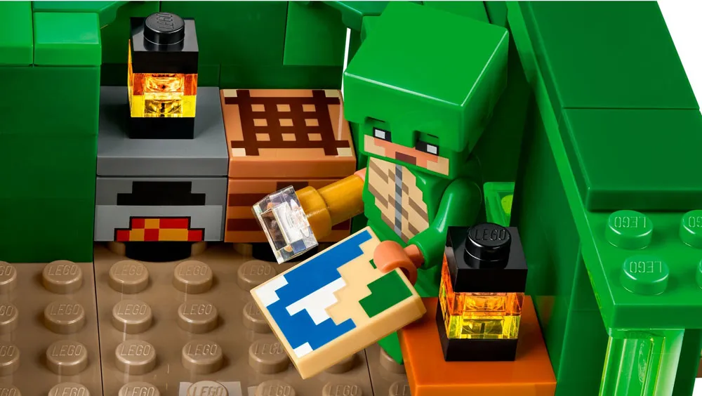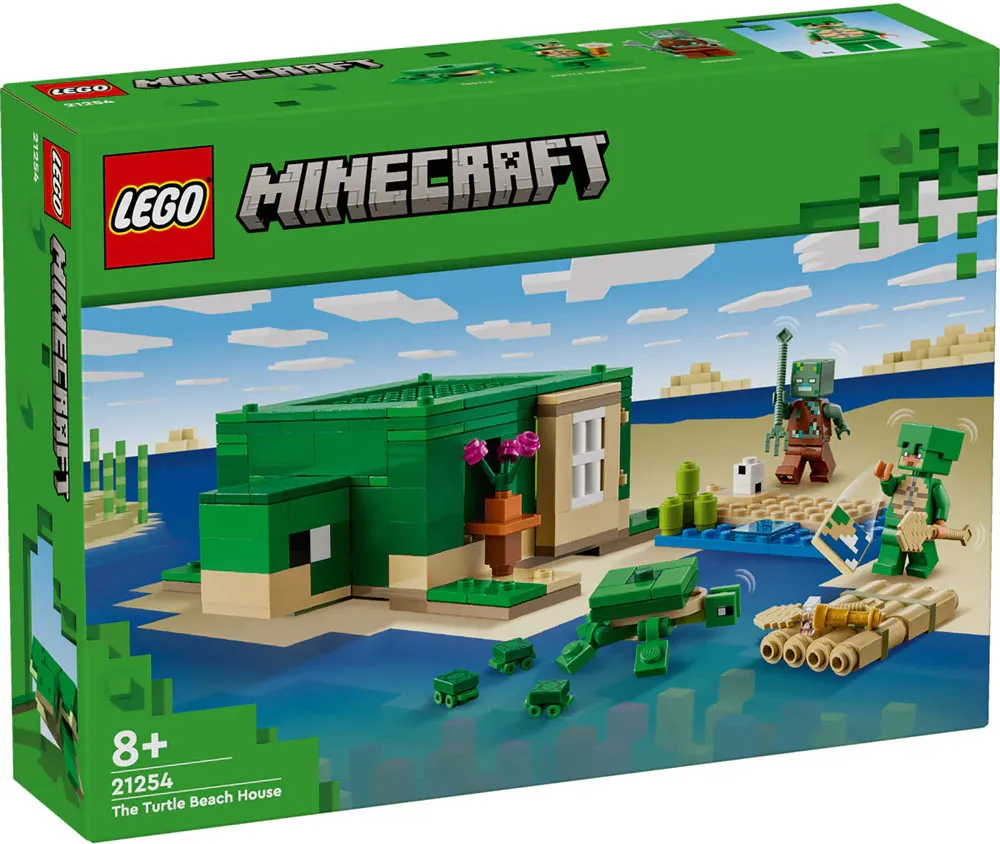 21254 LEGO Minecraft Kornjačina kuća na plaži. Model kuće u obliku kornjače iz igre Minecraft pun je akcije i životinjske zabave u stilu Minecrafta. Komplet LEGO Minecraft Kornjačina kuća na plaži (21254) s 3 poznata lika i fora modelom za slaganje odličan je poklon za djecu i igrače Minecrafta od 8 godina i starije. Igrači sastavljaju kuću iz Minecrafta u obliku kornjače s prozorima, svjetiljkama, vratima, krevetom, stolom, stolom za crafting i peći. Krov se može podignuti za jednostavan pristup unutrašnjosti. Vani su plaža sa šećernom trskom, kornjačina jaja i splav od bambusa s veslima. Tu su i poznate figure i likovi iz Minecrafta: ratnik kornjača s kacigom, utopljenik s trozupcem, kornjača koja gricka alge te 3 male kornjače. Osim tih dodataka, uz model za igrače Minecrafta dolaze i dalekozor i karta. Obožavateljima akcijskih videoigara, kreativnog slaganja i brige o životinjama svidjet će se svestrana igračka. Kada graditelji požele još digitalne zabave, u aplikaciji LEGO Builder mogu približavati i okretati 3D modele te pratiti napredak. Preporučena dob: 8 ili više godina. LEGO dijelova: 234