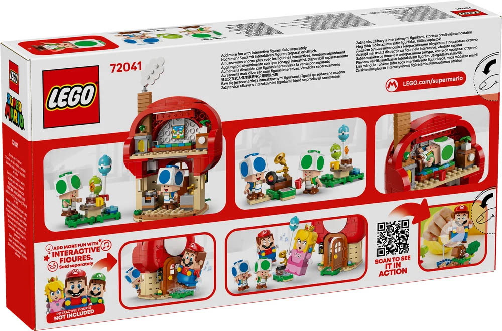 72041 LEGO Super Mario Zabava u Toadovoj kući. Blue Toad i Green Toad organiziraju proslavu! Pomozi im da pripreme hranu u kuhinji i rasporede balone u vrtu. Probaj tortu i zavrti gramofonsku ploču. Poslije se možeš odmoriti u spavaćoj sobi! Za interaktivnu digitalnu igru trebaju ti LEGO Mario, LEGO Luigi ili LEGO Peach (figure nisu dio kompleta). Kada dođu na zabavu, neka skoče na akcijske oznake i aktiviraju zvukove i glazbu! Preporučena dob: 7 ili više godina. LEGO dijelova: 276