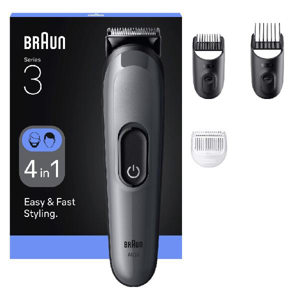 Braunov multifunkcionalni 4-u-1 komplet muškarcima omogućuje lako i jednostavno uređivanje dlačica na licu i frizure. Iznimno oštra oštrica osigurava brzo i učinkovito, ali i ugodno i precizno podrezivanje. Možete birati između 14 duljina pa je potpuna kontrola u vašim rukama. U kompletu dobivate perive glave i češljiće te četkicu za brzo i lako čišćenje uređaja. AIO3500 dolazi u sivoj boji, stvoren je da traje i ima bateriju koja omogućuje 50 minuta rada.