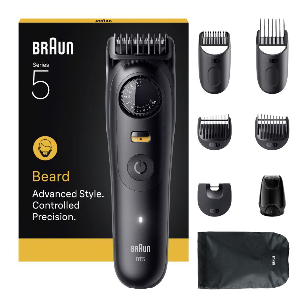 Braun Beard Trimmer Series 5 osmišljen je za kontrolu i preciznost tako da podigne vašu rutinu uređivanja dlačica na višu razinu. Savršen pri svakom potezu s izuzetno oštrom oštricom za ujednačeno podrezivanje svaki put. Zaključavanje preciznog kotačića omogućuje besprijekornu kontrolu s 40 postavki duljine u koracima od po 0,5 mm. Ovaj vrhunski trimer omogućuje podrezivanje, definiranje rubova i uređivanje detalja s najboljim alatima, kako biste dobili savršene linije, stanjivanje i završno dotjerivanje. Stvoren da traje, vodoootporan, s postoljem za punjenje te litij-ionskom baterijom za do 120 minuta rada.