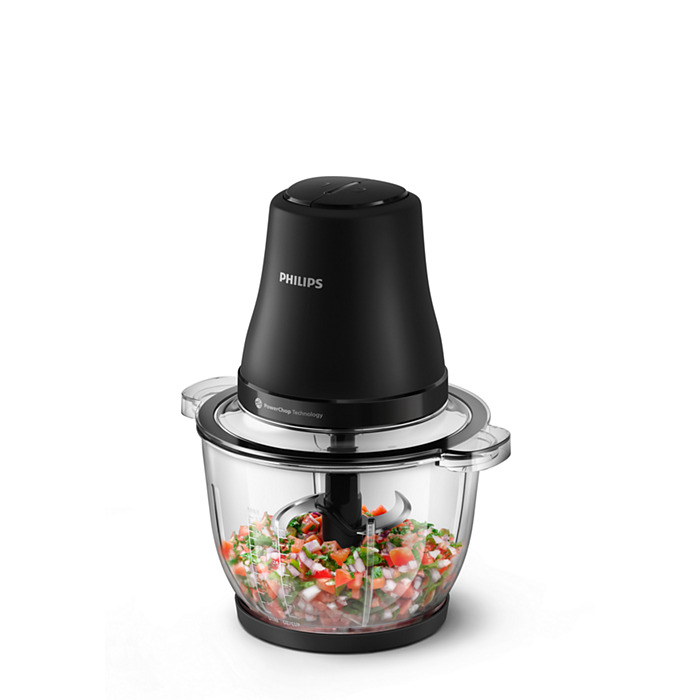 Ova velika sjeckalica jednostavna za uporabu idealan je kuhinjski partner za pripremu domaćih jela. Sjeckajte i drobite bilo koji sastojak zahvaljujući snažnom motoru te bezbrižno pripremajte omiljene umake. Ravnomjerno sjeckajte meke i tvrde sastojke zahvaljujući tehnologiji PowerChop koja optimalno kombinira rezače, kut rezanja i unutarnju zdjelu. Sjeckajte jednom rukom zahvaljujući stabilnosti sjeckalice koju osigurava gumena baza. Sastojke možete sjeckati s lakoćom zahvaljujući radu s dvije brzine. Od umaka do salata, ova sjeckalica lako obrađuje sve vrste sastojaka. Zdjela i rezači mogu se prati u perilici posuđa.