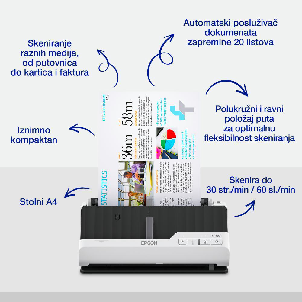 DS-C330 je iznimno svestran, pa skenira omotnice i PL kartice, kao i dugi papir i A3 papir (uvezani). S nosačem listova, može skenirati i putovnice i brošure debljine do čak 5 mm. DS-C330 ima i niz značajki poboljšanja koje vam omogućuju poboljšanje oštrine teksta, kao i ispravljanje preklapanja rubova, oštećenja i sjena na rubovima te uklanjanje otvora za registrator. Usto, skenirajte u Microsoftove aplikacije Word, Excel i PowerPoint. Kompatibilan sa sustavima Windows, Mac i Chromebook.