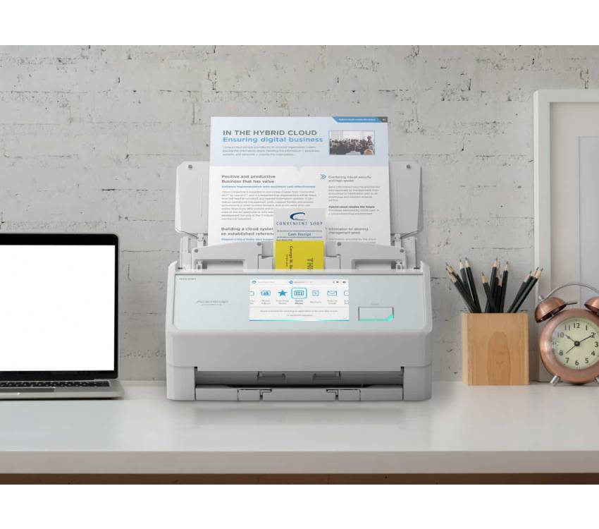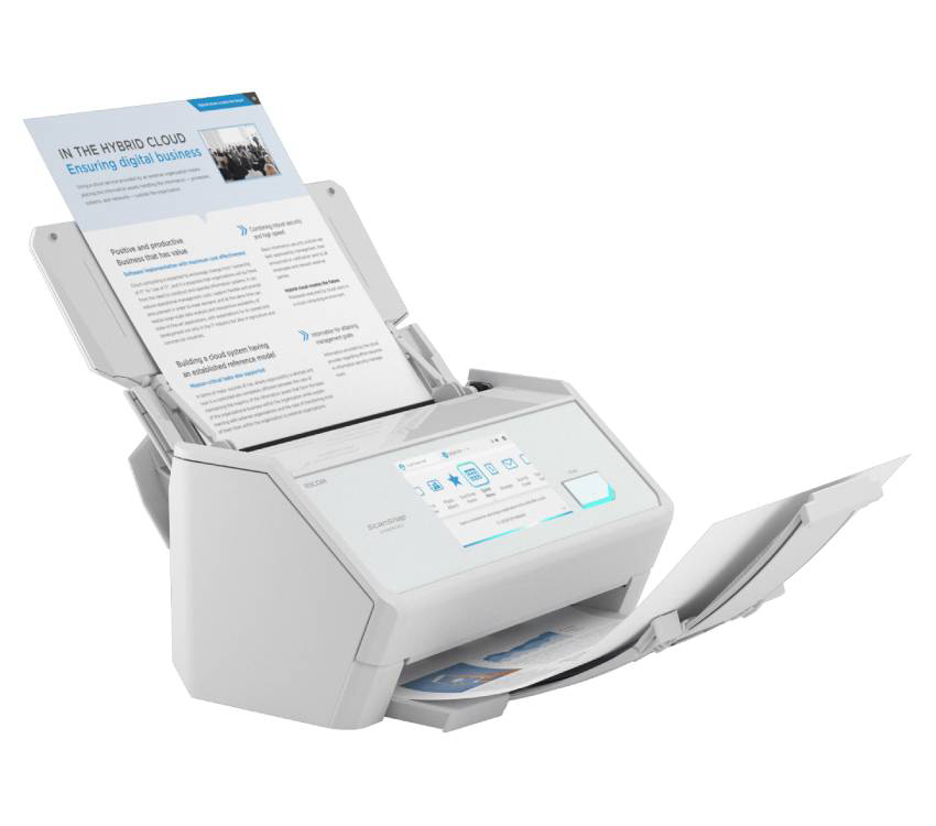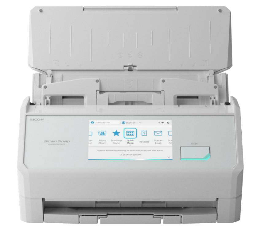 Ricoh ScanSnap iX2500 bijeli je brzi stolni A4 dokument skener s automatskim ulagačem od 100 listova i obostranim (duplex) skeniranjem do 45 stranica u minuti. Opremljen je 5-inčnim kolor IPS touch zaslonom za jednostavno biranje profila skeniranja, ima optičku rezoluciju 600 x 600 dpi te podržava USB, Wi-Fi (uključujući Wi-Fi 6) i Bluetooth povezivanje za skeniranje direktno na računalo, mobitel ili u cloud servise. Jamstvo 36 mjeseci zamjena unaprijed (Advance Exchange), 12 mjeseci osnovno + 24 mjeseca uz besplatnu registraciju na linku https://service.pfu-emea.ricoh.com/s/login/?language=en