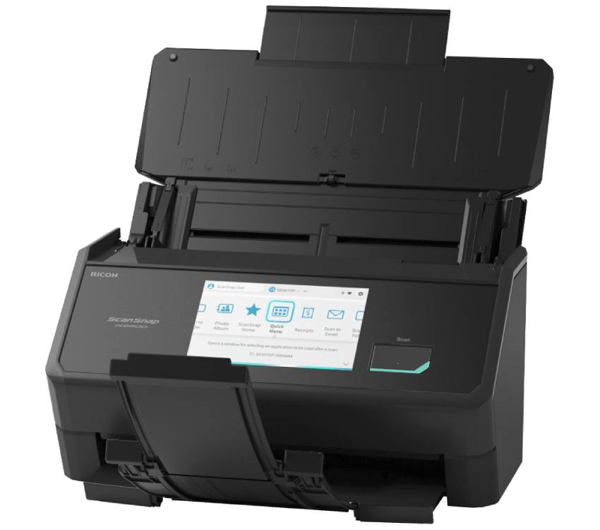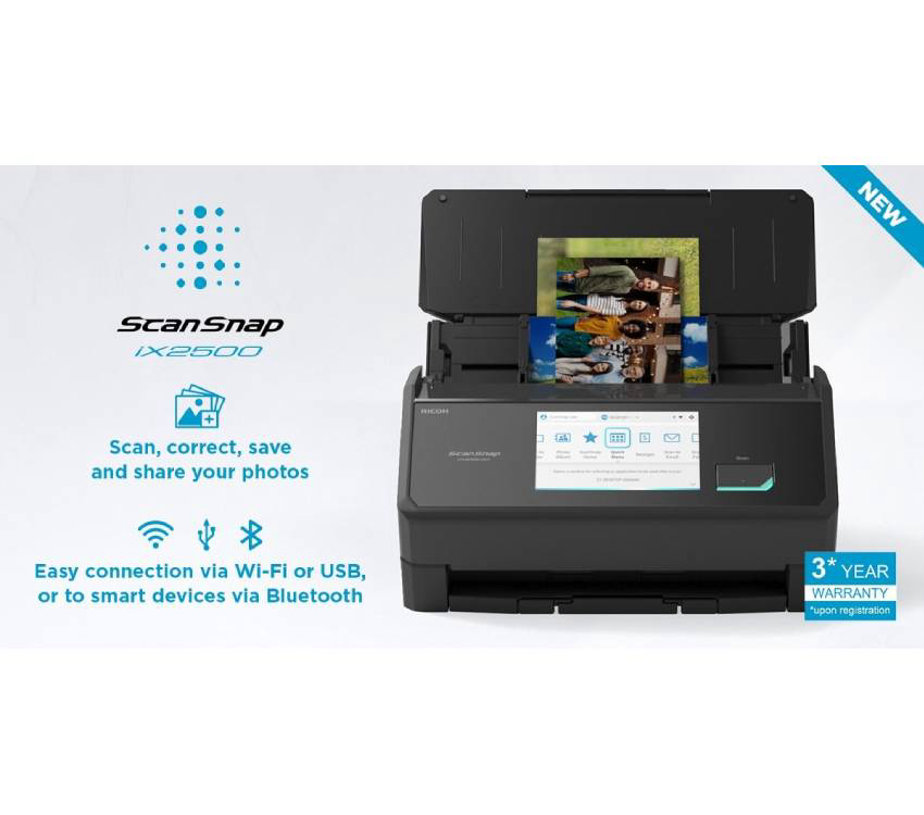 Ricoh ScanSnap iX2500 crni je brzi stolni A4 dokument skener s automatskim ulagačem od 100 listova i obostranim (duplex) skeniranjem do 45 stranica u minuti. Opremljen je 5-inčnim kolor IPS touch zaslonom za jednostavno biranje profila skeniranja, ima optičku rezoluciju 600 x 600 dpi te podržava USB, Wi-Fi (uključujući Wi-Fi 6) i Bluetooth povezivanje za skeniranje direktno na računalo, mobitel ili u cloud servise. Jamstvo 36 mjeseci zamjena unaprijed (Advance Exchange), 12 mjeseci osnovno + 24 mjeseca uz besplatnu registraciju na linku https://service.pfu-emea.ricoh.com/s/login/?language=en