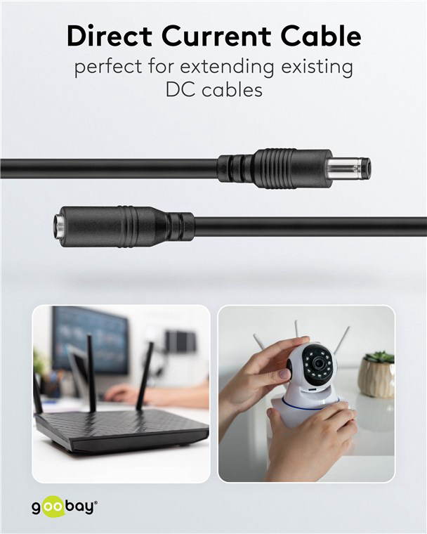 Produžuje postojeći mrežni priključni kabel ili jedinicu za napajanje do 5 m. Opremljen s 1x DC utikačem (5,5 x 2,1 mm) i 1x DC utičnicom (5,5 x 2,1 mm).