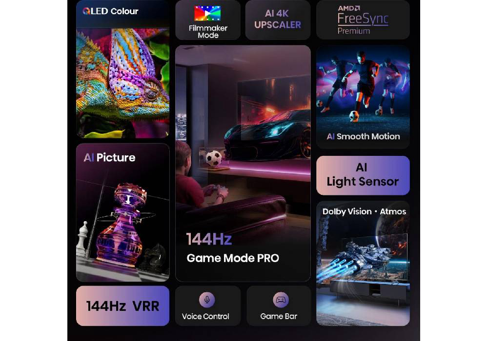 Otključajte svoj krajnji igrački potencijal uz 144Hz Game Mode PRO s integriranom trakom za igru, oprostite se od kašnjenja i uživajte u igranju bez suza. Doživite vizualni užitak uz QLED Colour. Svaki kadar je bogat, živahan i realističan, osiguravajući da se svaka boja, od najsuptilnije do najživlje, ističe. Okupljeni surround zvukom iz vašeg televizora i soundbara. S Hi-Concerto, oba uređaja rade zajedno, gradeći jednostavno kućno kino bez muke s dodatnim kabelima ili hardverom. *Hi-Concerto radi samo s odabranim Hisense modelima televizora. Ugrađeni subwoofer u vašem televizoru pruža duboki bas. Čujte tutnjave niske tonove u svakoj sceni, od suptilnih ritmova pjesama do burnih akcijskih blockbustera. Podignite svoje audio iskustvo na novu razinu.