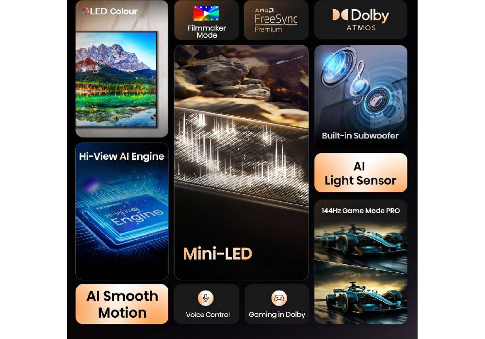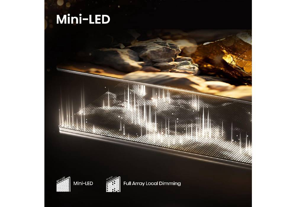 Mini-LED tehnologija podiže vaše iskustvo gledanja na višu razinu, oživljavajući živopisnu svjetlinu i otkrivajući duboke, bogate sjene s nevjerojatnom jasnoćom. Hi-View AI Engine uvijek nudi optimalno vizualno iskustvo. Funkcije poput AI 4K Upscalera preoblikuju vaš omiljeni sadržaj u zapanjujuću 4K kvalitetu. Bez obzira na sadržaj, uvijek izgleda bolje nego ikad. Otključajte svoj vrhunski igrački potencijal uz 144Hz Game Mode PRO s integriranom igraćom trakom, recite zbogom kašnjenju i uživajte u igri bez trganja slike. Ugrađeni subwoofer u vašem televizoru pruža duboki bas. Čujte tutnjave niske tonove u svakoj sceni, od suptilnih ritmova pjesama do burnih akcijskih blockbustera. Podignite svoje audio iskustvo na novu razinu. Doživite vizualni užitak uz QLED Colour. Svaki kadar je bogat, živahan i realističan, osiguravajući da se svaka boja, od najsuptilnije do najživlje, ističe. Doživite poruku onakvu kakva je bila zamišljena uz Filmmaker Mode. Prilagodite svoj video na izvorne postavke da biste vidjeli pojedinosti poput zvuka, omjera slike, boje, broja sličica u sekundi i još mnogo toga kako je izvorno zamišljeno za najautentičniji prikaz remek-djela vašeg omiljenog redatelja, prije nego što je promijenjeno za općenito gledanje.