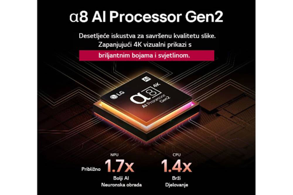 LG-jeva najnovija i jedinstvena tehnologija širokog raspona boja, koja zamjenjuje Quantum Dot, nudi poboljšanu stopu reprodukcije boja. MiniLED, pokretan novim Alpha AI procesorom, pruža ultra jasan kontrast i realistične detalje na LG QNED evo. AI Super Upscaling i Dynamic Tone Mapping Pro analiziraju elemente svakog kadra kako bi poboljšali razlučivost, svjetlinu, dubinu i jasnoću. Lakše upravljajte svojim televizorom pomoću AI Magic Remote-a - nije potreban nikakav drugi uređaj! Jednostavne, ali moćne značajke klika, povlačenja i ispuštanja čine korištenje webOS-a intuitivnim i jednostavnim. Imate vlastitog AI Chatbota koji aktivno rješava probleme i pomaže vam sa zahtjevima. On jednostavno razgovara s televizorom jer može klasificirati vaše namjere i reagirati u skladu s tim.