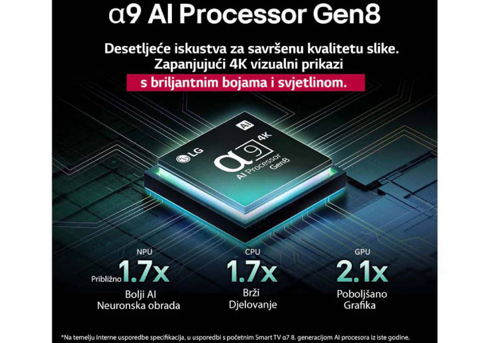 LG OLED C51LA ističe se izvanrednom kvalitetom slike i elegantnim dizajnom. Zahvaljujući OLED tehnologiji, ovaj model nudi savršen prikaz crne boje i iznimno visok kontrast, jer svaki piksel emitira vlastito svjetlo i može se potpuno isključiti. Pogoni ga ?9 AI procesor 4K šeste generacije, koji koristi umjetnu inteligenciju za optimizaciju slike i zvuka u stvarnom vremenu. Televizor podržava Dolby Vision i Dolby Atmos, što dodatno doprinosi impresivnom audiovizualnom doživljaju. Uz to, ima frekvenciju osvježavanja od 120 Hz i podršku za HDMI 2.1, što ga čini odličnim izborom za gaming na konzolama nove generacije poput PlayStationa 5 ili Xbox Series X. WebOS operativni sustav omogućuje jednostavan pristup brojnim aplikacijama za streaming, dok glasovno upravljanje putem LG-jevog AI ThinQ sustava ili Google Assistanta pruža dodatnu praktičnost. Zahvaljujući tankom okviru i modernom dizajnu, ako se uklapa u svaki interijer, bilo da je postavljen na stalak ili montiran na zid.