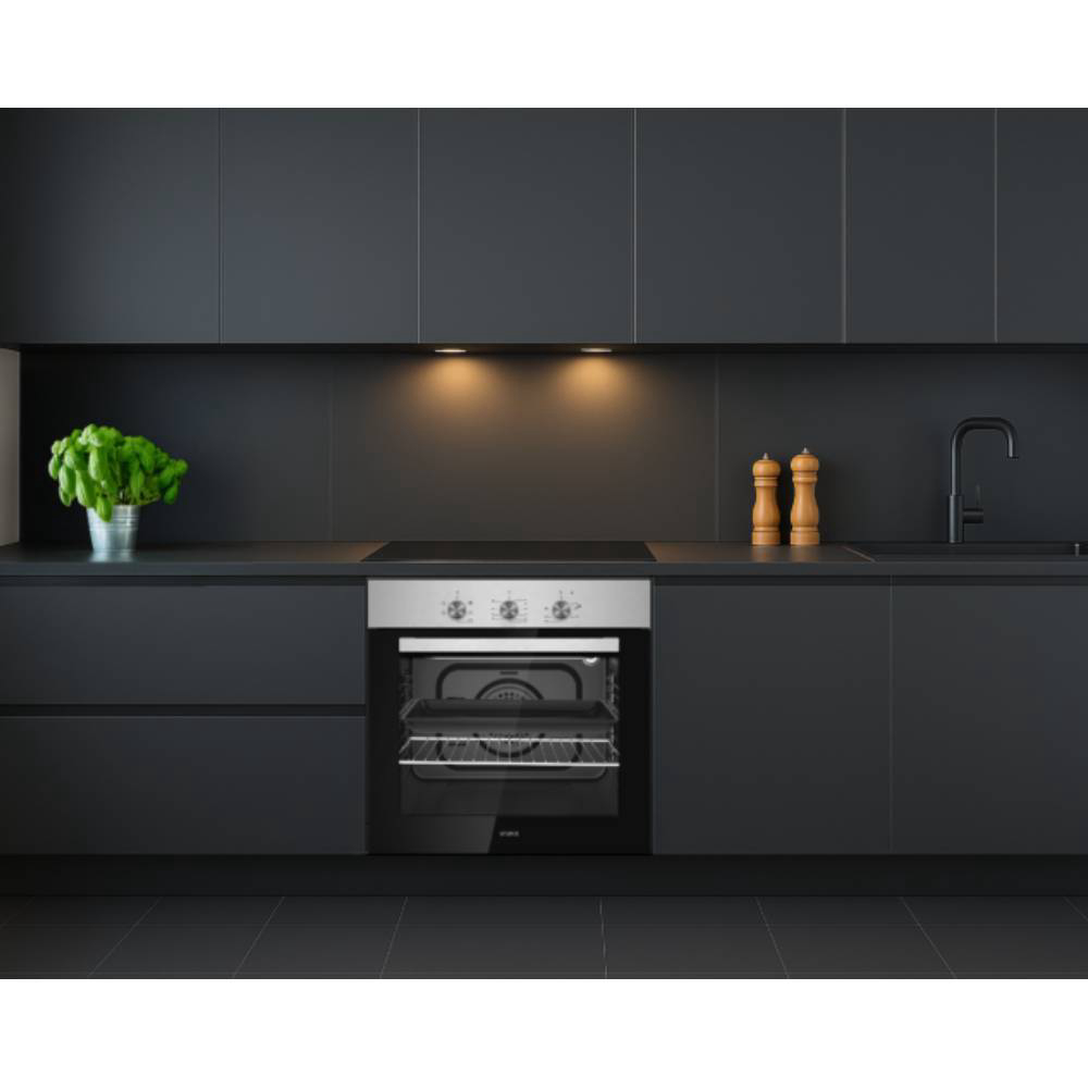 VIVAX HOME ugradbena pećnica BO-606FTM X donosi praktičnost i pouzdanost u kombinaciji s modernim inox dizajnom, kapacitetom od 60 litara i ventilatorskim sistemom koji omogućava ravnomjerno i učinkovito pečenje. S 5 osnovnih programa, temperaturom u rasponu od 40°C do 240°C i snagom od 2200 W, idealna je za svakodnevnu pripremu različitih jela. Mehanički tajmer omogućuje jednostavno upravljanje pečenjem, a energetski razred A osigurava štedljivu potrošnju energije. Standardne dimenzije od 59,5 x 57,5 x 59,5 cm omogućuju lako uklapanje u svaku modernu kuhinju, čineći ovu pećnicu praktičnim i estetski privlačnim izborom za vaš dom.