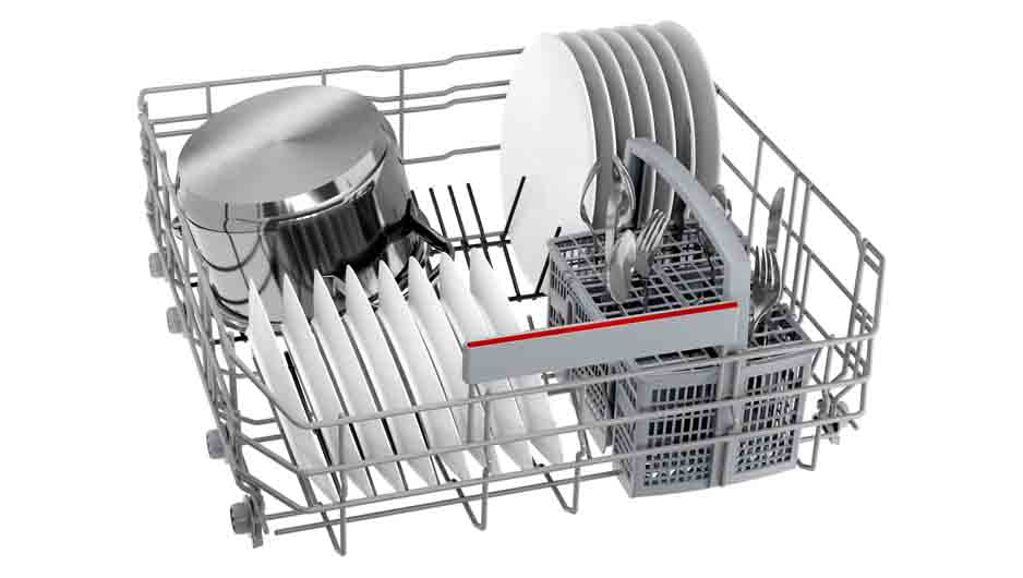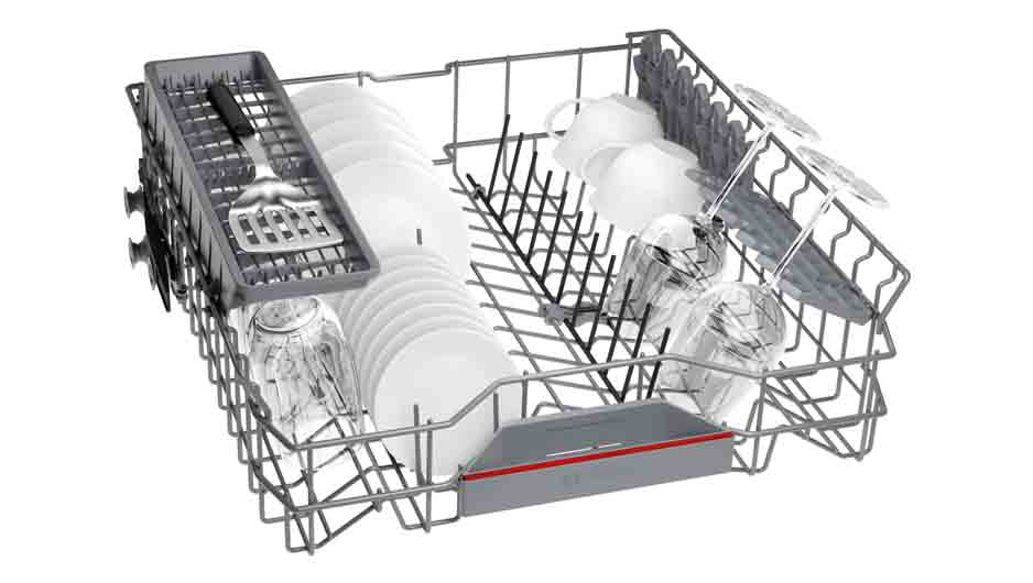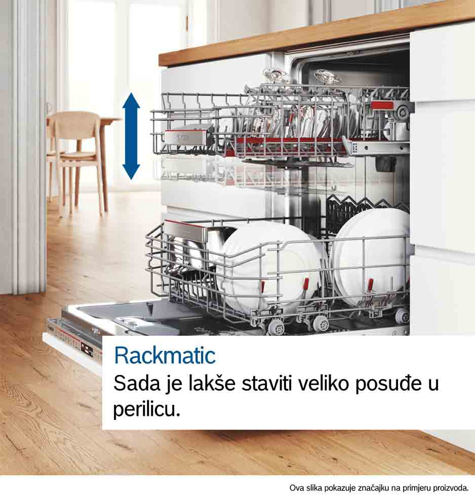 Ugradbena perilica posuđa BOSCH SMV4HAX09E dolazi s ExtraDry opcijom koja temeljito osuši posuđe zahvaljujući višim temperaturama tijekom ispiranja i duljoj fazi sušenja. Info Light projicira crveno svjetlo na pod tijekom ciklusa pranja, pa uvijek znate kada vaša perilica posuđa radi. DosageAssist osigurava optimalne rezultate čišćenja i tiše pranje. Deterdžent kaplje iz pretinca za sredstvo za pranje na posebni pladanj na gornjoj košari gdje se do kraja otapa.