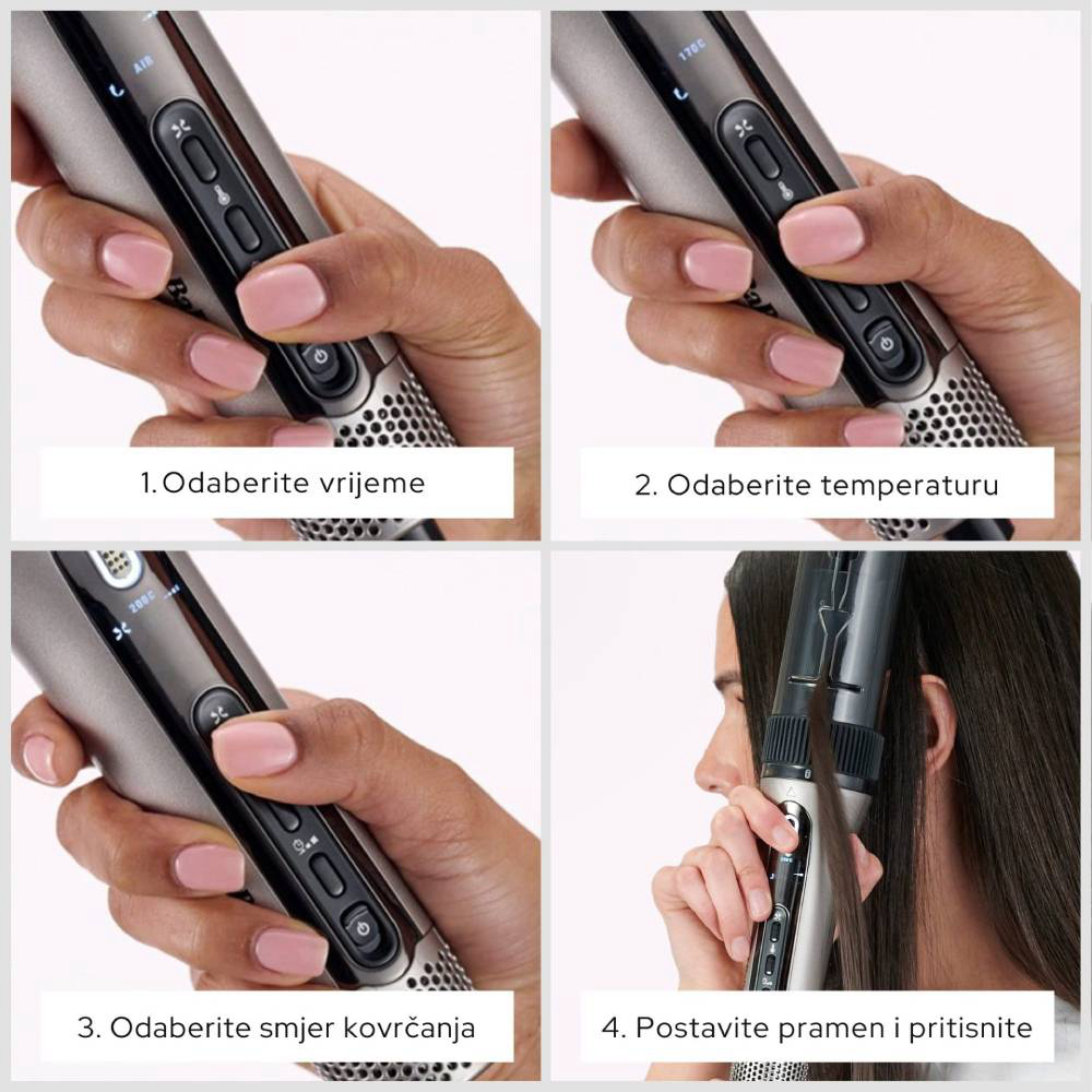 Bez napora oblikujte definirane kovrče, nježne valove ili blow out frizuru pomoću ovog automatskog uređaja za uvijanje i oblikovanje kose. Uživajte u sigurnom i jednostavnom stiliziranju s dugotrajnim rezultatima i visokim sjajem. Automatski obavija i oblikuje kosu oko cilindra za brze rezultate bez petljanja. Savršeno za postizanje kovrča uz minimalan trud. Birajte između 4 postavke topline/protoka zraka, 4 postavke vremena i 3 smjera uvijanja kako biste stvorili različite stilove — od blagih valova do jasno definiranih kovrča. Četiri postavke vremena pomažu vam stvoriti različite vrste kovrča, dajući vam kontrolu nad njihovom zategnutošću i definicijom.