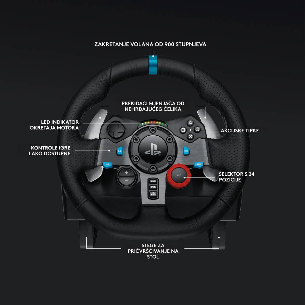 Logitech G29 Driving Force volan namijenjen za PlayStation 5, PlayStation 4 i PlayStation 3. Osmišljen za preciznu vožnju s dugotrajnom pouzdanošću i izdržljivošću. Logitech G29 Driving Force ima dvostruki motor s force feedback mehanizmom i spiralnim prijenosnikom bez praznog hoda, volan s kožnom presvlakom i pedale od nehrđajućeg čelika.