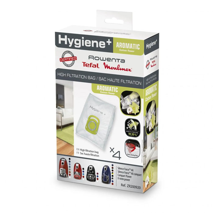 Vrećica Rowenta ZR200940 Hygiene+ Aromatic Cotton Flower osigurava 99,99% filtriranje. Zahvljujući automatskom zatvaranju oblak prašine neće vas iznenaditi pri promjeni vrećice. Poseban sastav vrećice skupa s filtrom ispred i iza motora osigurava 99,99% filtracije. Vrećica je sastavljena od 4 sloja, uključujući HEPA sloj, za maksimalnu učinkovitost filtracije zraka kroz usisavač. U pakiranju su 4 komada.