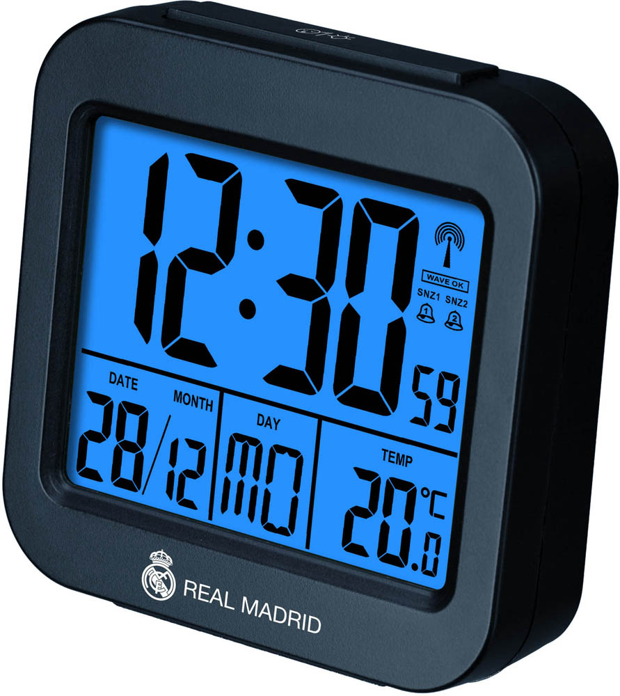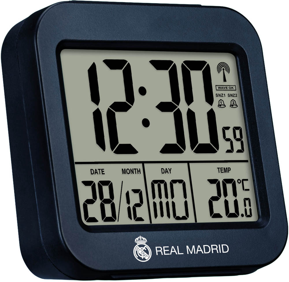 Sve bitno na jednom mjestu - temperatura, automatsko vrijeme i datum s danom u tjednu te dvostruki alarm - sve u nepogrešivom stilu Real Madrida! Pravi Madridisti zaslužuju tehnologiju pouzdanu kao i njihov klub - i to je upravo ono što pruža kompaktna meteorološka stanica Real Madrida, kombinirajući precizne informacije s ponosnim dizajnom Los Blancosa. Ugrađeni termometar Vas u svakom trenutku obavještava o trenutnoj unutarnjoj temperaturi. Zahvaljujući sinkronizaciji DCF radio signala, uređaj automatski prikazuje točno vrijeme i datum - nije potrebno ručno podešavanje, a uključen je i pomak za različite vremenske zone.