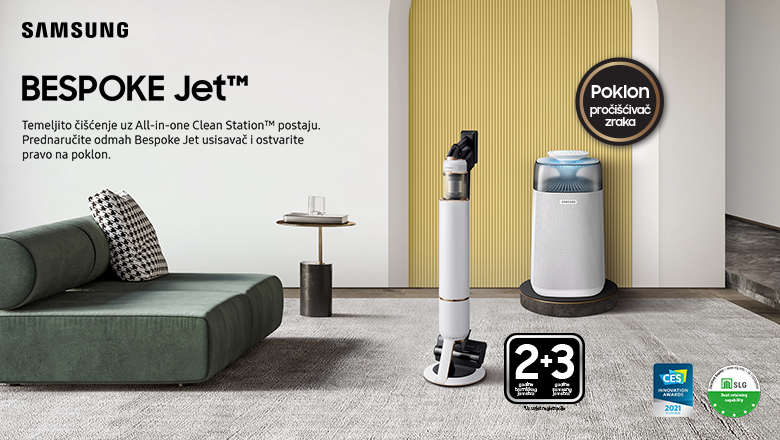 Prednaručite Bespoke Jet usisavač i očistite temeljito svoj dom uz All-in-one Clean Station™ postaju, a mi vam darujemo Samsung pročišćivač zraka s višeslojnim sustavom pročišćivanja.