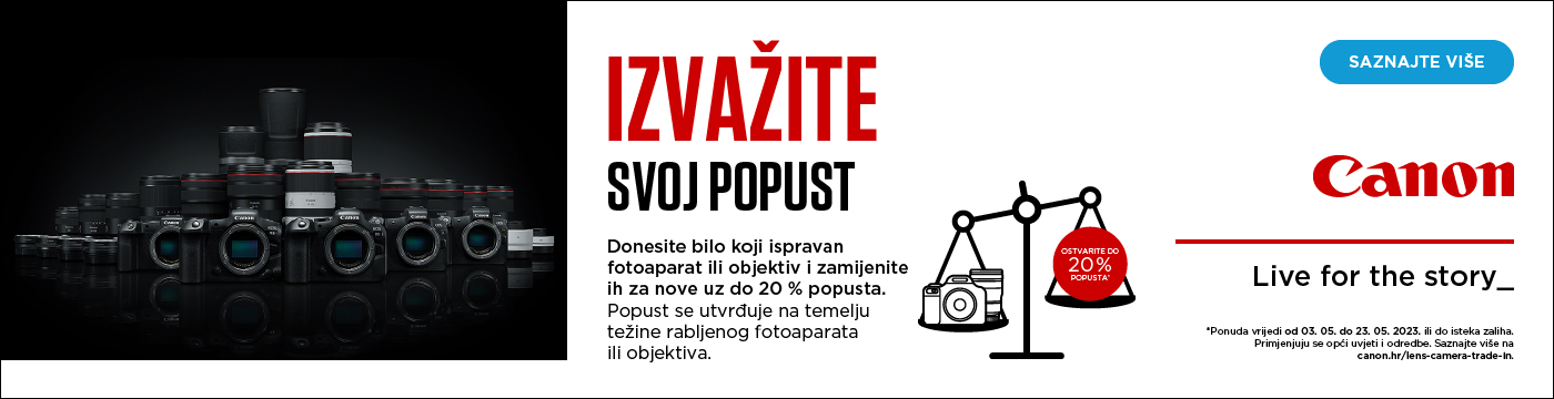 Obogatite i poboljšajte svoje fotografsko stvaralaštvo fotoaparatom iz obitelji EOS R i iznimnim RF objektivima koji će vam otvoriti svijet neograničenih fotografskih mogućnosti te donijeti još više kreativne slobode! Donesite bilo koji ispravan fotoaparat ili objektiv i zamijenite ih za nove uz do 20% popusta. Popust se utvrđuje na temelju težine rabljenog fotoaparata ili objektiva.