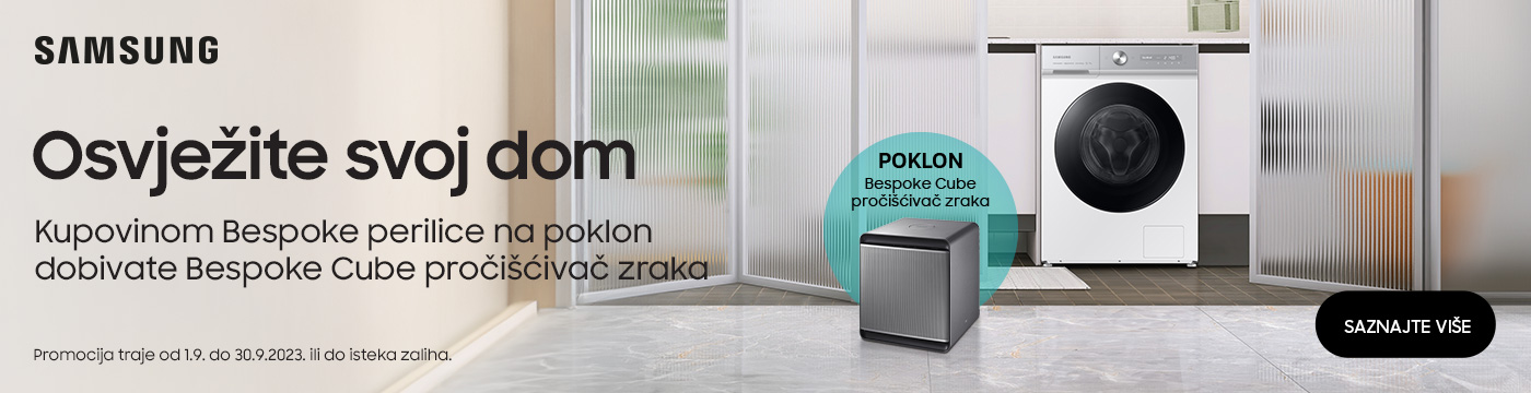 Za svaku kupnju Bespoke perilice, kupac na poklon dobiva Bespoke Cube pročišćivač zraka. Za poklon se potrebno prijaviti na ce.promo@samsung.com do 15.10.2023. Promocija je dostupna kod Samsung prodajnih partnera navedenih u pravilima promocije.