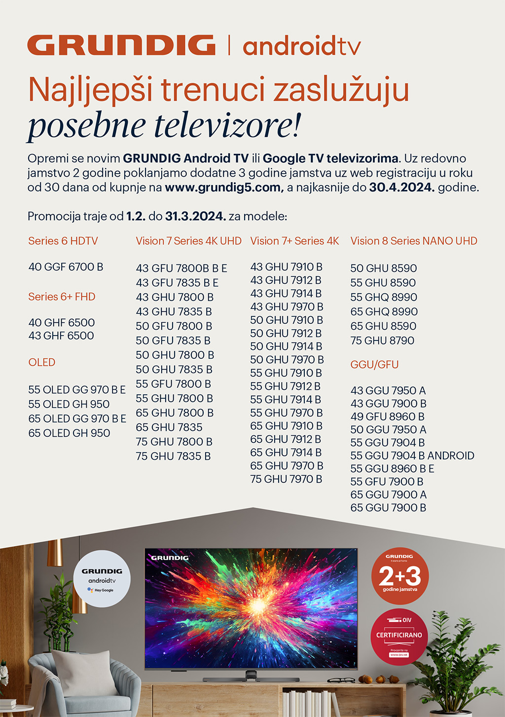 *Da biste ostvarili produljeno petogodišnje jamstvo, neophodno je da svoj TV registrirate najkasnije do 30.04.2024. Ukoliko imate pitanja u vezi registracije, molimo Vas da se javite mailom na: info-hr@grundig5.com