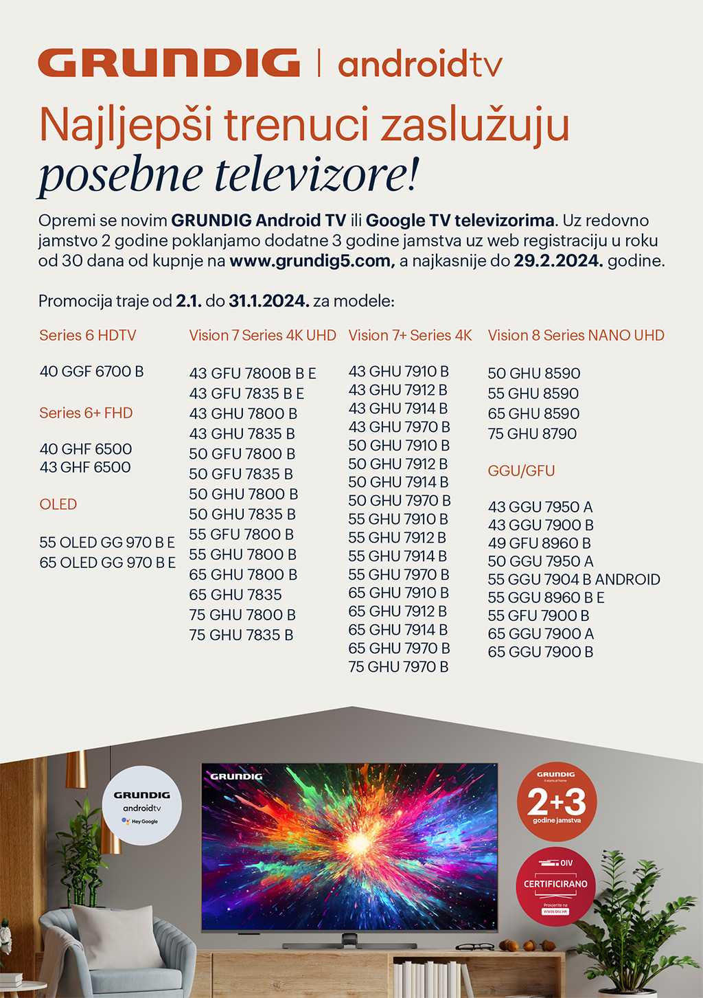 *Da biste ostvarili produljeno petogodišnje jamstvo, neophodno je da svoj TV registrirate najkasnije do 29.02.2024. Ukoliko imate pitanja u vezi registracije, molimo Vas da se javite mailom na: info-hr@grundig5.com