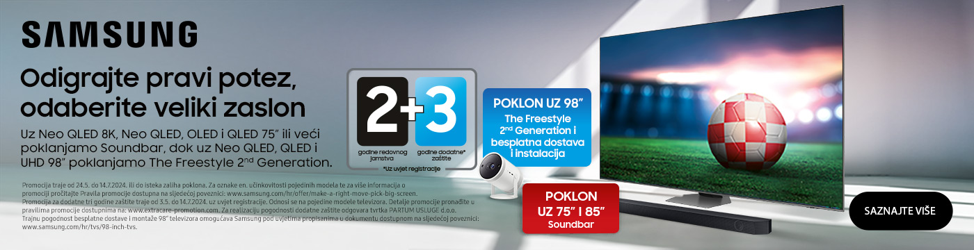 Promocija za tri godine dodatne zaštite traje od 3.5. do 14.7.2024. godine i odnosi se na Neo QLED, Neo QLED 8K, OLED, QLED iz 2023. I 2024. godine, i The Frame modele iz 2023. i 2024. godine. Za ostvarivanje dodatne zaštite potrebno se registrirati na www.extracare-promotion.com. Za realizaciju pogodnosti dodatne zaštite odgovara Partum Usluge d.o.o. Detalje promocije pronađite u Pravilima promocije koja su dostupna na prethodno navedenoj poveznici.
