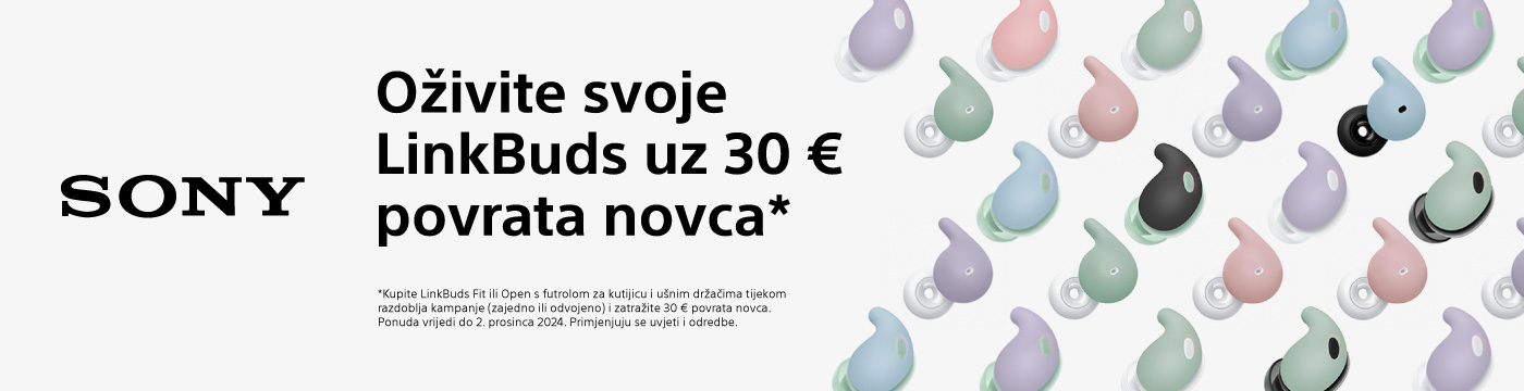 Ponuda je važeća za slušalice LinkBuds koje ispunjavaju uvjete kupljene od trgovaca koji sudjeluju u promociji te koje ste kupili zajedno s dodatnom opremom LinkBuds koja ispunjava uvjete odnosno koje ste kupili nakon kupnje te opreme. Zahtjevi za povrat novca za kupljene slušalice LinkBuds i dodatnu opremu mogu se predati 30 dana nakon kupnje.