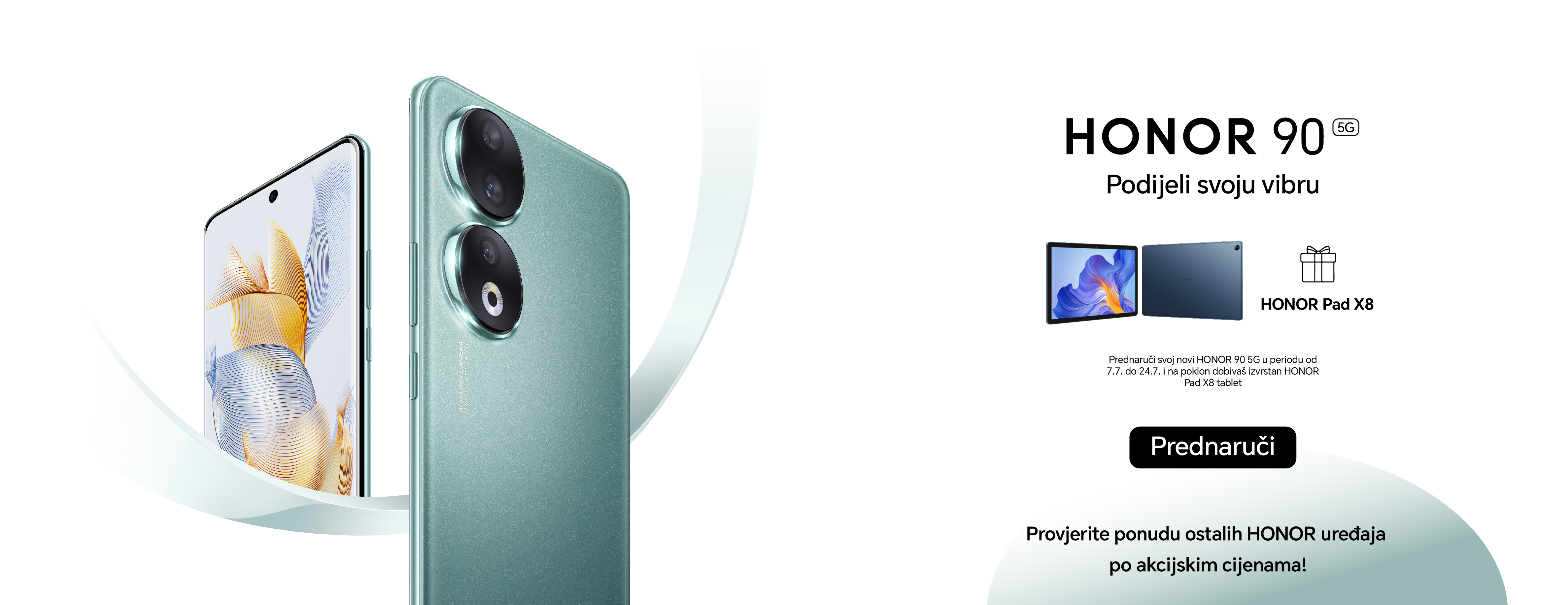 Prednaruči svoj novi HONOR 90 5G u periodu od 07.07. do 24.07.2023. i na poklon dobivaš izvrstan HONOR Pad X8 tablet.