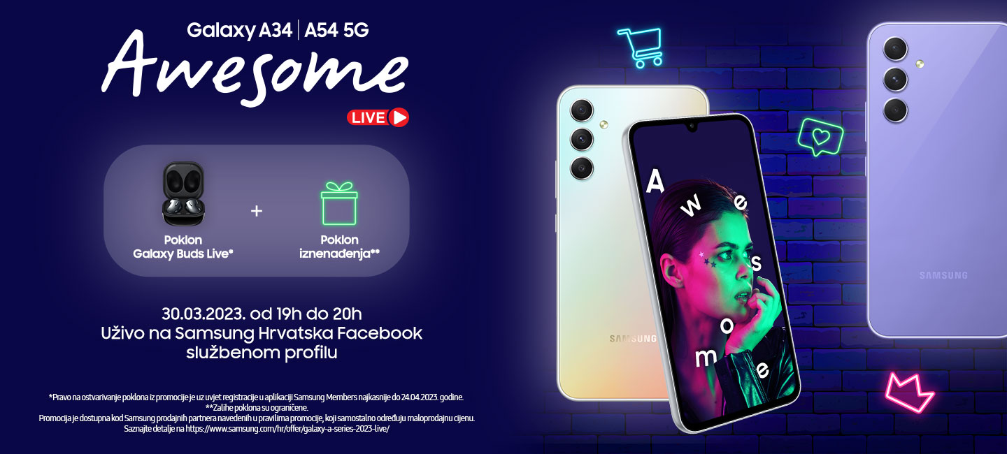 Ne propustite fenomenalnu promociju uživo na Samsung Hrvatska Facebook službenom profilu tijekom 30. ožujka 2023. godine od 19 sati jer Vas čekaju na poklon Galaxy Buds Live slušalice* i poklon iznenađenja** ako prednaručite novi Galaxy A34 5G ili Galaxy A54 5G tijekom trajanja livestreama!
