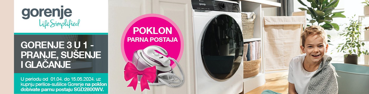 Za vas je perilica-sušilica rublja savršeno rješenje jer donosi maksimalnu učinkovitost pranja i sušenja u malim prostorima. Perilice-sušilice rublja Gorenje visoko su energetski učinkovite, izdržljive i imaju nisku razinu buke. Kupite perilicu – sušilicu rublja u razdoblju od 01.04. do 15.05.2024. godine, registrirajte svoju kupnju i na poklon dobivate parnu postaju za glačanje kako bi briga o rublju bila još jednostavnija!