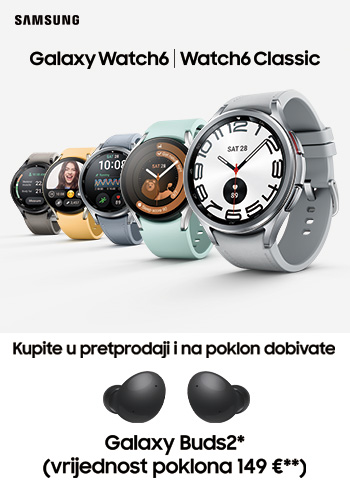 Kupite u pretprodaji satove iz Samsung Galaxy Watch 6 serije i ostvarite pravo na poklon Galaxy Buds2 slušalice Vrijedi od 26.07. do 10.08.2023. ili do isteka zaliha!