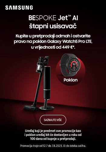 Prednaručite novi Samsung Bespoke JET AI uz Galaxy Watch 5 PRO na poklon Vrijedi od 12.07. do 07.08.2023. ili do isteka zaliha!
