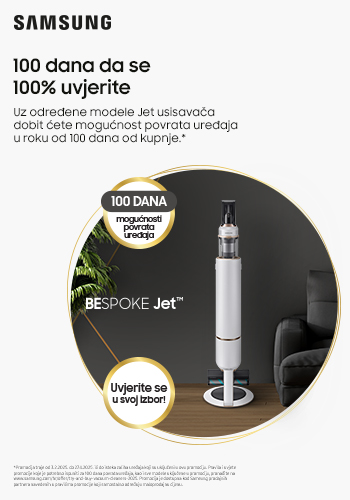 100 dana da se 100% uvjerite u moć Samsung Jet usisavača Vrijedi od 03.02. do 27.04.2025. ili do isteka zaliha!