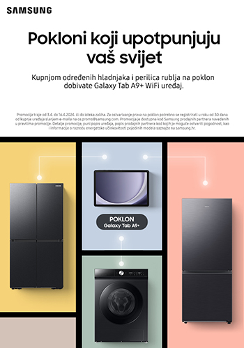 Kupnjom određenih Samsung hladnjaka i perilica rublja na poklon dobivate Galaxy Tab A9+ Vrijedi od 03.04. do 16.04.2024. ili do isteka zaliha!