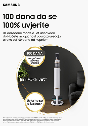 100 dana da se 100% uvjerite u snagu Samsung Jet usisavača Vrijedi od 01.04. do 31.05.2024. ili do isteka zaliha!
