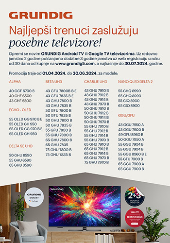 Opremi se novim Grundig televizorima uz 5 godina jamstva Vrijedi od 01.04. do 30.06.2024. ili do isteka zaliha!