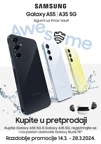 Kupite Samsung Galaxy A55 ili A35 5G u pretprodaji i dobivate na poklon Galaxy Buds FE slušalice Vrijedi od 14.03. do 28.03.2023. ili do isteka zaliha!