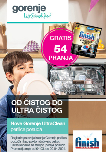 Uz novu Gorenje UltraClean perilicu posuđa dobivate gratis paket Finish kapsula Vrijedi od 04.03. do 29.04.2024. ili do isteka zaliha!