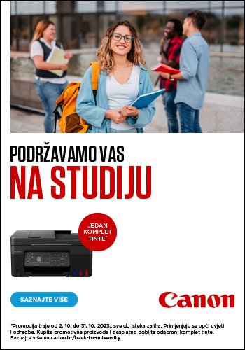 Kupite odabrani pisač tvrtke Canon i besplatno dobijte do godišnje zalihe spremnika tinte Vrijedi od 02.10. do 31.10.2023. ili do isteka zaliha!