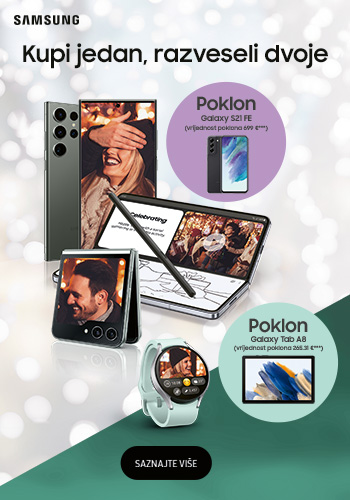 Kupnjom odabranih Samsung mobitela i satova na poklon dobivate mobitel Galaxy S21 FE i tablet Galaxy Tab A8 Vrijedi od 12.10. do 12.11.2023. ili do isteka zaliha!